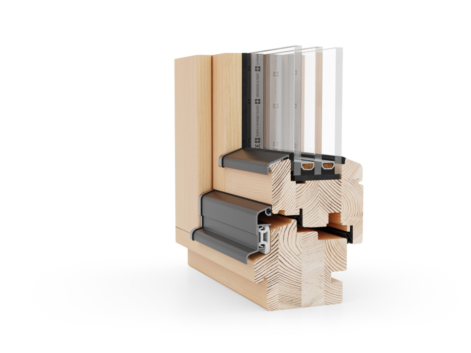 Dem Holzrahmen wird auf der Außenseite unten eine Aluminiumschale angebracht, die eine Verlängerung der Dauerhaftigkeit des Fensters und neue Farbkombinationen ermöglicht.